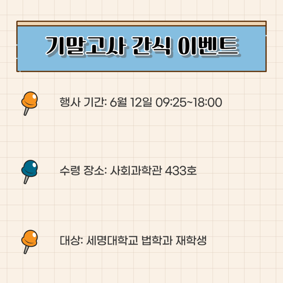 본문 시작 홈으로 커뮤니티 학과안내 교수소개 학과과정 커뮤니티 홈페이지가이드 학과사진첩 공지사항 취업정보 학과사진첩 학과행사 동아리 학생회 교우소식 학과사진첩 페이스북 트위터 프린트 법학과 간식 이벤트🍪 법학과 1247 2025-06-12 법학과 학생회 "다온" 에서 시험으로 지친 학생들을 위해 간식이벤트를 준비했습니다:) 목록 이전2025학년도 법학과 학술캠프 다음 법학과 선배들의 진로 현황 담당부서 : 법학과 담당자 : - 연락처 : 043-649-1764 최종수정일 : 2024-10-26 만족도조사 만족도 조사 이 페이지에서 제공하는 정보에 대하여 만족하시나요? 매우만족 만족 보통 불만족 매우불만족