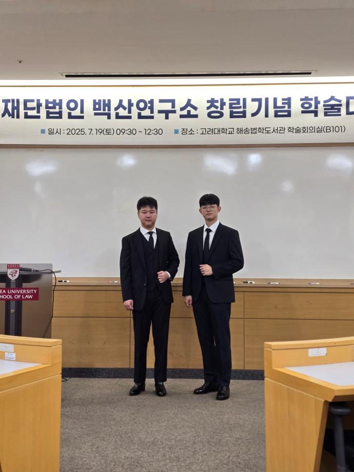본문 시작 홈으로 커뮤니티 학과안내 교수소개 학과과정 커뮤니티 홈페이지가이드 학과사진첩 공지사항 취업정보 학과사진첩 학과행사 동아리 학생회 교우소식 학과사진첩 페이스북 트위터 프린트 [2025 입시홍보활동] 고려대학교 재단법인 백산연구소 창립기념 학술대회 참가 법학과 1331 2025-07-21 7.19 이진효 교수님께서 대학원 진학을 목표로 하고 있는 재학생(장건희, 한다훈)들과 고려대학교 대학원 방문 재단법인 백산연구소 창립기념 학술대회 참가하셨습니다. 목록 이전[2025 입시홍보활동] 세명고등학교 입시 홍보 방문 다음 법학과 전공체험 7. 23 담당부서 : 법학과 담당자 : - 연락처 : 043-649-1764 최종수정일 : 2024-10-26 만족도조사 만족도 조사 이 페이지에서 제공하는 정보에 대하여 만족하시나요? 매우만족 만족 보통 불만족 매우불만족