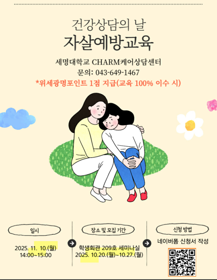 본문 시작 홈으로 학과생활 학과소개 교수소개 교과과정 학과생활 홈페이지가이드 사진게시판 공지사항 사진게시판 전공자료실 동아리 학과행사 사진게시판 페이스북 트위터 프린트 [CHARM케어상담센터] 2025학년도 2학기 자살예방교육 진행 안내 산업디자인학과 247 2025-10-21 목록 이전[긴급공지] 최근 급증 중인 '캄보디아 불법 고용, 납치' 사례 주의 안내 다음 [CHARM케어상담센터] 2025학년도 2학기 알코올중독 예방 및 스트레스 대처 관련 교육 진행 안내 담당부서 : 산업디자인학과 담당자 : - 연락처 : 043-649-1436 최종수정일 : 2024-10-26 만족도조사 만족도 조사 이 페이지에서 제공하는 정보에 대하여 만족하시나요? 매우만족 만족 보통 불만족 매우불만족