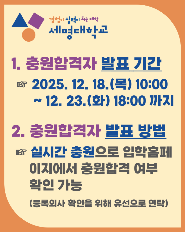 본문 시작 홈으로 학과생활 학과소개 교수소개 교과과정 학과생활 홈페이지가이드 사진게시판 공지사항 사진게시판 전공자료실 동아리 학과행사 사진게시판 페이스북 트위터 프린트 [수시모집] 2026학년도 수시모집 충원합격자 발표안내 산업디자인학과 267 2025-12-18 목록 이전[수시모집] 2026학년도 수시모집 최초합격자 등록안내 다음 [정시모집] 2026 세명대학교 정시모집 전형방법 담당부서 : 산업디자인학과 담당자 : - 연락처 : 043-649-1436 최종수정일 : 2024-10-26 만족도조사 만족도 조사 이 페이지에서 제공하는 정보에 대하여 만족하시나요? 매우만족 만족 보통 불만족 매우불만족