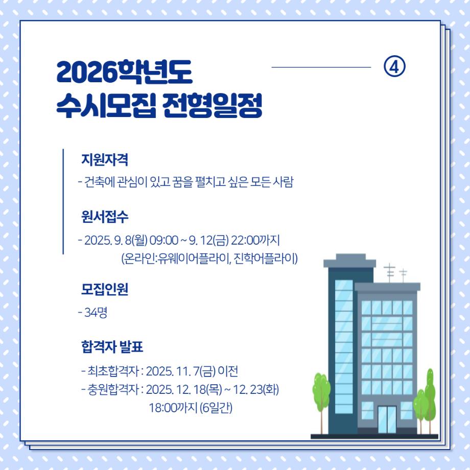 본문 시작 홈으로 커뮤니티 학과소개 교수소개 교육과정 학과 행사 및 활동 커뮤니티 홈페이지가이드 열린정보 학과일정 학과공지 채용정보 및 자료 열린정보 포토갤러리 먹거리, 즐길거리 포토갤러리 사진 사진 영상 사진 페이스북 트위터 프린트 사진 영상 2026학년도 수시모집 - 건축학과 건축학과 814 2025-08-12 목록 이전2025 지역연계 창의융합 캠프 운영 다음 2026 수시주요사항 및 전년도 입시결과 만족도조사 만족도 조사 이 페이지에서 제공하는 정보에 대하여 만족하시나요? 매우만족 만족 보통 불만족 매우불만족