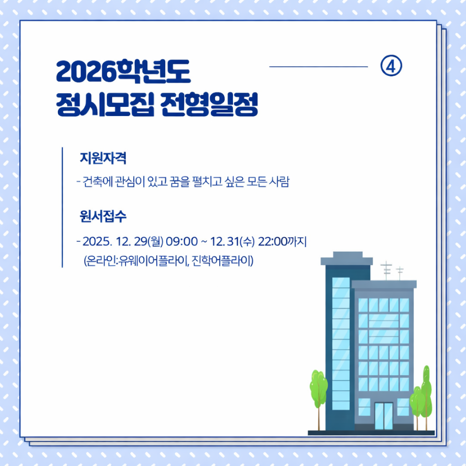 본문 시작 홈으로 커뮤니티 학과소개 교수소개 교육과정 학과 행사 및 활동 커뮤니티 홈페이지가이드 열린정보 학과일정 학과공지 채용정보 및 자료 열린정보 포토갤러리 먹거리, 즐길거리 포토갤러리 사진 사진 영상 사진 페이스북 트위터 프린트 사진 영상 [ 건축학과] 2026학년도 정시 원서접수(12.29~31) 건축학과 207 2025-12-30 목록 이전[2026 정시] 모집 안내 다음 2026학년도 정시모집 및 편입학 최초합격자 발표 만족도조사 만족도 조사 이 페이지에서 제공하는 정보에 대하여 만족하시나요? 매우만족 만족 보통 불만족 매우불만족